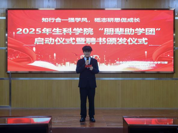 活动伊始,现场举行了“学在生科”朋辈助学团聘书颁发仪式。该助学团由各班级学习委员、国家奖学金/省级奖学金获得者、优秀推免生等骨干力量组成,兼具扎实的专业功底、丰富的实践经验与强烈的责任担当,是学院搭建“朋辈引领、精准帮扶”长效机制的核心抓手,也寄托了学院对他们发挥榜样力量、助力学风建设的殷切期望。今后,朋辈助学团的成员将以“朋辈导师”的身份常态化开展帮扶活动,让“崇实笃学、求是创新”的学风精神在师生间、同学间持续传递。