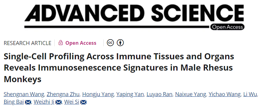 昆明理工大学灵长类转化医学研究院/省部共建非人灵长类生物医学国家重点实验室司维教授和季维智院士研究团队通过对青年和自然衰老猕猴的造血组织(骨髓)、免疫淋巴组织(肠系膜淋巴)、外周血单个核细胞(PBMCs)以及免疫器官(脾脏)进行了单细胞转录组分析,发现各组织之间存在广泛的转录重塑现象,特别是在衰老猕猴多种细胞类型中 GZMB 表达显著上调,提示了其作为免疫衰老候选生物标志物的重要性。该成果于2026年1月20日发表在Advanced Science杂志发表题为“Single-Cell Profiling Across Immune Tissues and Organs Reveals Immunosenescence Signatures in Male Rhesus Monkeys”的文章。