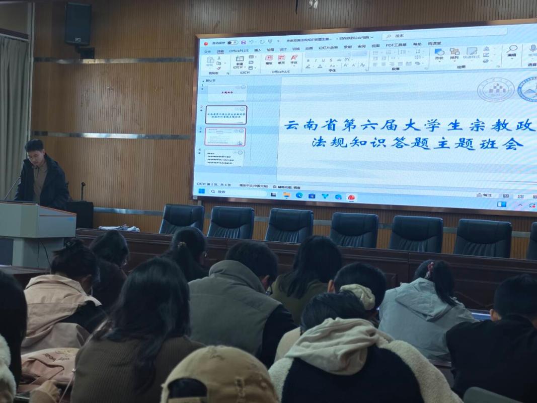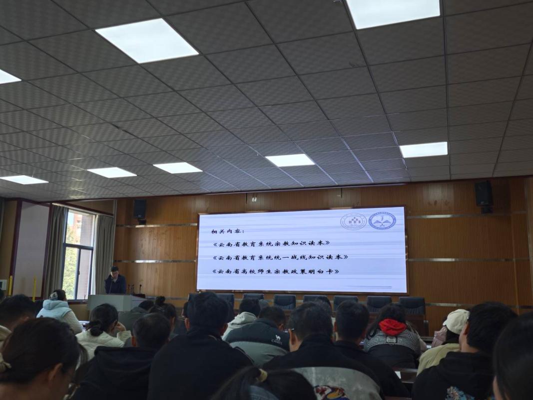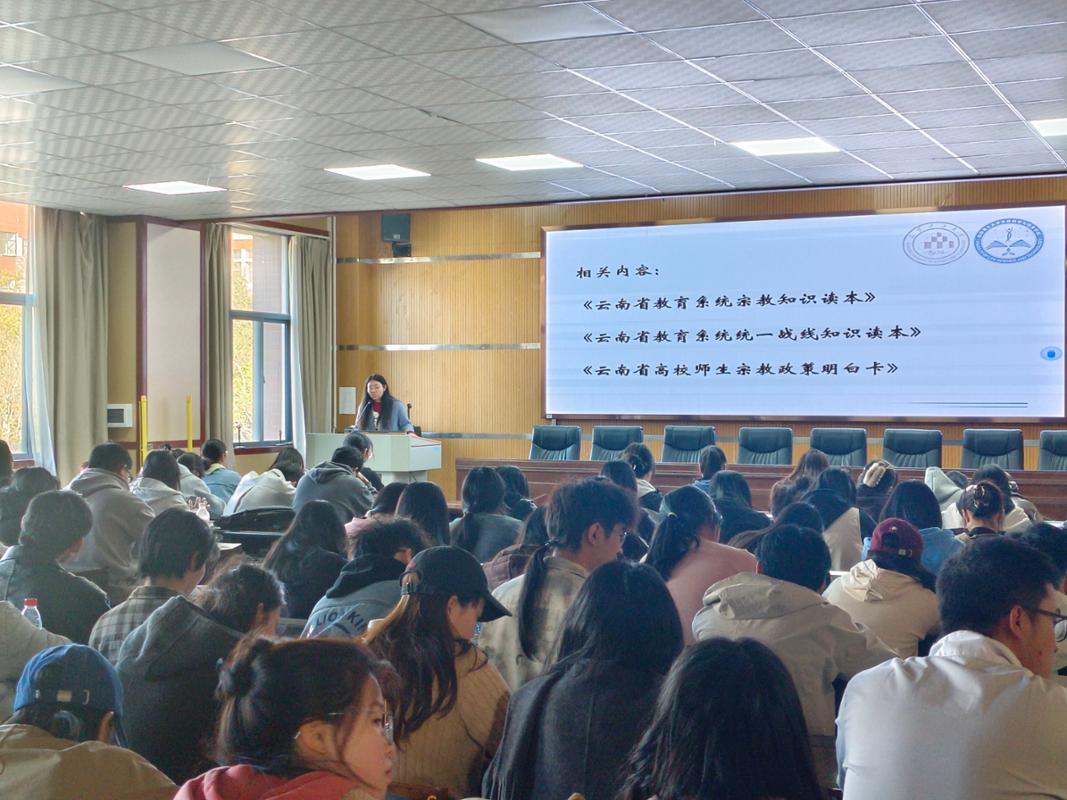 为广泛宣传党的宗教政策和国家有关法律法规,加强对大学生的马克思主义宗教观和无神论教育,引导学生正确认识和对待宗教,树立正确的世界观、人生观、价值观,筑牢抵御宗教渗透和防范校园传教的思想防线,组织开展宗教政策法规知识答题主题活动。根据《互联网宗教信息服务管理办法》、《云南省教育系统宗教知识读本》、《云南省教育系统统一战线知识读本》、《云南省高校师生宗教政策明白卡》等宗教政策法规知识主要内容,带领同学们一起学习后现场答题并核对答案,根据答题情况有针对性地开展宗教政策和法律法规的宣传教育。