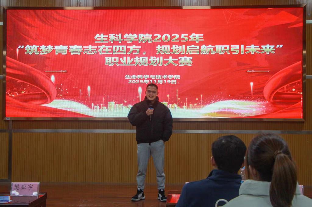 为进一步强化大学生职业生涯规划意识,引导青年学子锚定职业方向、明晰成长路径,2025年11月19日晚,昆明理工大学生命科学与技术学院学生会学习部在生科楼A200报告厅成功举办“筑梦青春志在四方,规划启航指引未来”2025年职业生涯规划大赛。学院党委副书记樊亚宇、团委书记李绍平、教师代表袁承、林奕岑、郑腊梅、25级辅导员曾召英、胡伟俊担任评委,以及来自全院各专业的11名学子同台竞技,展现青春担当与职业抱负。