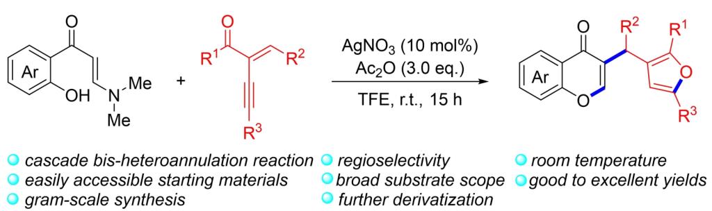 NH-取代烯胺酮,是一类最为常见的链状烯胺酮,结构中兼具多个亲核和亲电反应位点,具有结构多样、价廉易得等优势,是有机合成和药物开发的重要合成中间体,常用于合成具有潜在生物活性的杂环化合物和天然产物等。官能团化反应和串联环化反应是有机合成化学中两种步骤经济的合成策略,具有较高的原子经济性和合成效率。因此,基于简单易得的NH-取代烯胺酮为原料,发展新型的官能团化/环化反应,简洁高效构建结构多样的新化合物,具有重要的学术研究意义和实际应用价值。近两年来,余富朝教授团队基于NH-取代烯胺酮的官能团化和环化反应方面取得了一系列进展。