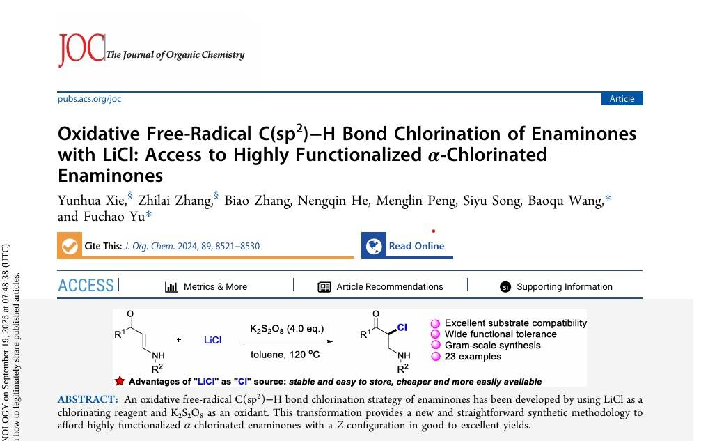 碳氯键(C-Cl)构建是有机合成化学的重要内容,其相关研究为天然产物合成、药物研发和功能材料等领域的发展作出了重要贡献。长期以来,双键上的C-Cl键构建主要利用两类氯源——有机氯化试剂和无机氯化试剂来实现。然而,有机氯化试剂存在着制备困难、价格昂贵等限制,而一些非盐类无机氯化试剂,如氯气、盐酸、三氯化磷等,则存在毒性大、储存困难、反应效率低等问题。氯化锂和氯化钠作为氯化试剂,在价格和来源等方面优势明显。2024年,余富朝教授团队开发了一种氧化自由基介导的C(sp²)-H键氯化策略,能够以易得的NH-取代烯胺酮类化合物和氯化锂为原料,高效构建具有Z-构型的α-氯代烯胺酮。该新方法的优势在于:1)采用廉价易得的氯化锂作为氯源,在无金属条件下实现氯化反应;2)具有优异的底物普适性和官能团兼容性;3)后处理简便、收率良好且可实现克级规模制备。(J. Org. Chem. 2024, 89, 8521−8530)
