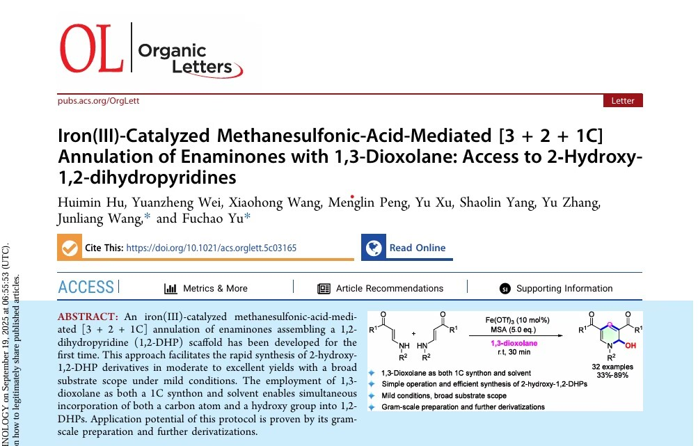 二氢吡啶是一类重要的氮杂环化合物,广泛存在于许多药物、天然产物和有机合成中间体结构中。与已得到广泛研究的1,4-二氢吡啶相比,构建1,2-二氢吡啶的方法仍十分有限且具有挑战性,因此开发新合成方法来高效制备1,2-二氢吡啶是非常有必要的。近日,余富朝教授团队报道了一种铁(III)催化甲烷磺酸(MSA)介导的NH-取代烯胺酮和1,3-二氧杂环戊烷的三组分反应,在室温下合成了1,2-二氢吡啶。值得注意的是,这是第一个通过[3+2+1C]环化反应构建1,2-二氢吡啶的实例,该反应中的1,3-二氧杂环戊烷不仅是合成二氢吡啶的反应物也作为反应溶剂。(Org. Lett. 2025. DOI: 10.1021/acs.orglett.5c03165)