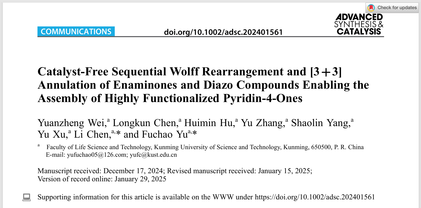 4-吡啶酮是天然产物和药物分子中最为常见的结构单元,具有广泛的药理活性。因此,4-吡啶酮骨架的合成方法已得到广泛研究。然而,这些合成方法仍存在着一些局限性,如使用复杂的功能化前体、苛刻的反应条件、反应效率低、使用过渡金属催化剂和繁琐的处理过程等。2025年,余富朝教授团队开发了一种基于NH-取代烯胺酮和重氮化合物的Wolff重排/[3+3]环化的新方法,高效合成结构多样的4-吡啶酮类化合物。该合成方法无需任何催化剂,以中等至优秀的产率合成具有广泛底物范围的4-吡啶酮,具有绿色的反应条件、宽泛的底物范围、克级合成和衍生化反应的实用性等特点。(Adv. Synth. Catal. 2025, 367, e202401561)