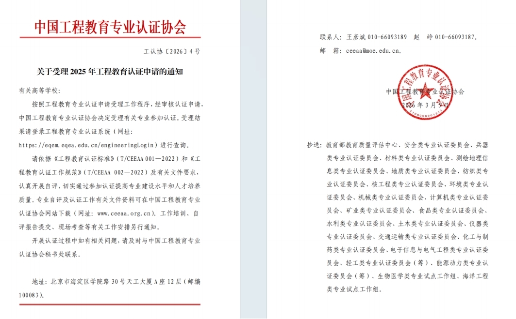近日,中国工程教育专业认证协会发布《关于受理2025年工程教育认证申请的通知》(工认协〔2026〕4号),我院制药工程专业和生物工程专业凭借扎实的专业建设基础、规范的教学管理体系和鲜明的人才培养特色,顺利获得认证受理。这是我院深耕工程教育认证、持续提升教育教学质量的重要阶段性成果,标志着我院在工程教育认证领域取得了新突破。