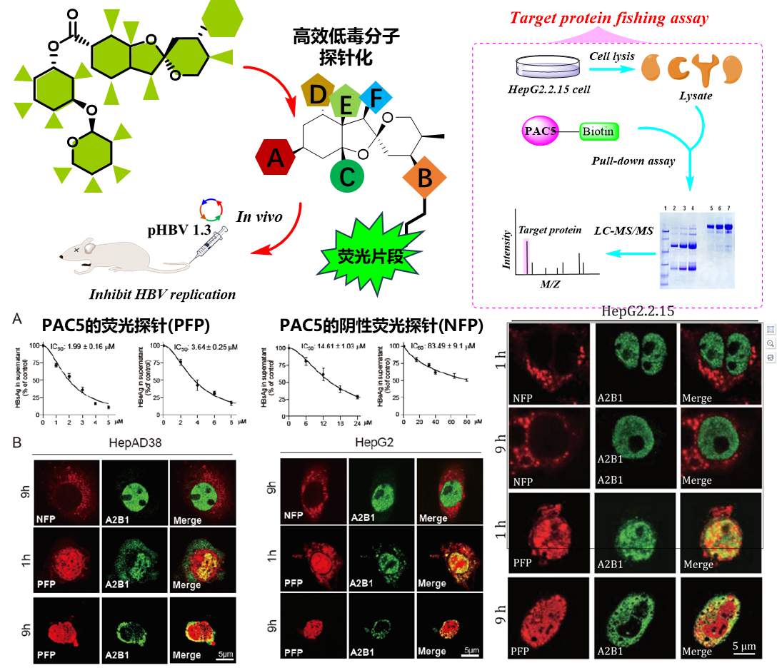 该方向聚焦具有显著抗HBV活性的天然产物及其衍生物,通过化学生物学技术手段(包括探针标记、蛋白组学、转录组等),系统阐明其作用靶标与分子机制;同时开发基于天然片段的高精度工具化合物,设计合成探针,驱动乙肝治疗新靶点的发现与验证,为抗病毒创新药物研发提供源头支撑。