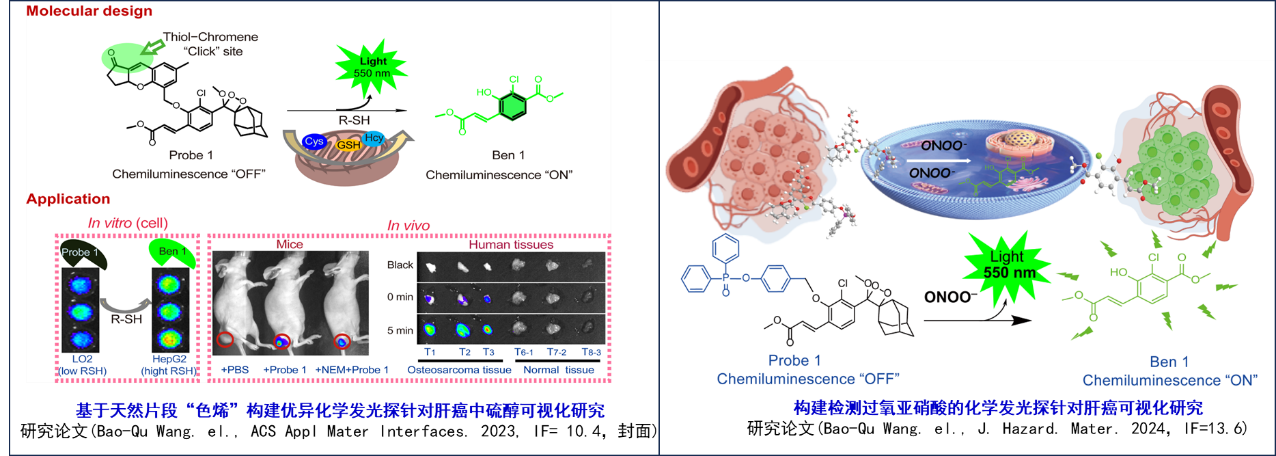 课题组聚焦光学功能探针的构建及疾病分子影像诊断治疗应用,致力于开发靶标触发的原位动态成像工具。针对肿瘤诊疗需求, 基于化学发光技术无需激发光、高信噪比的优势,构建新型化学发光探针。