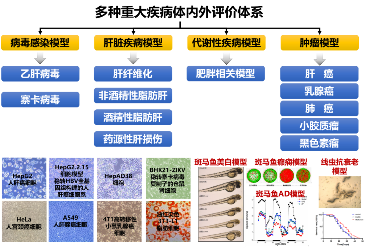 病毒性肝炎:HBV体外感染模型(HepG2.2.15细胞等)及小鼠体内药效评价平台乙肝病毒、寨卡病毒体外筛选平台及相应体内药效评价模型。
