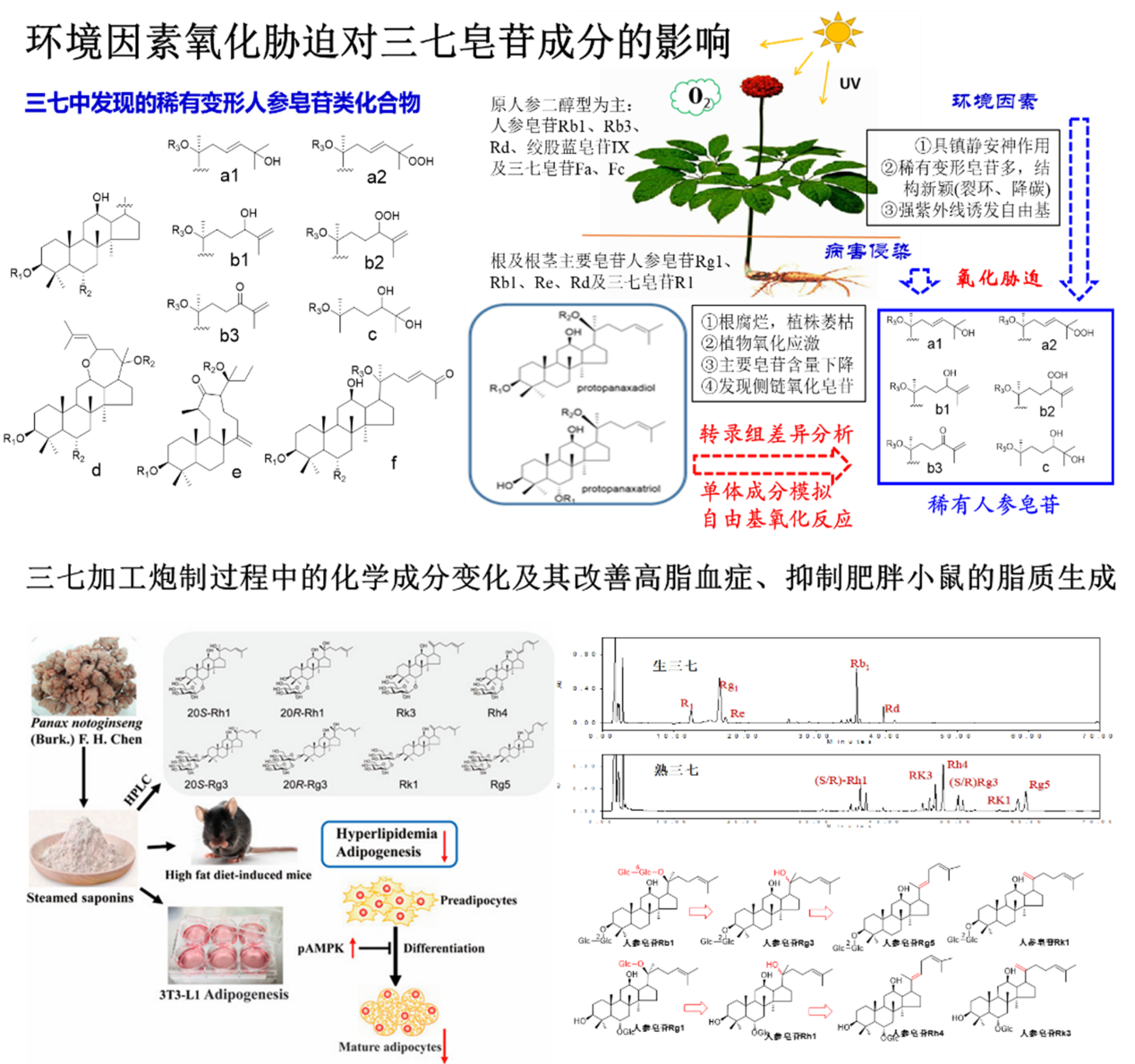 课题组同时深耕天然产物过程化学领域。天然产物在环境胁迫以及药材加工炮制过程中会发生一系列转化反应,这极大丰富了其分子多样性。然而,这类转化反应的高度复杂性也导致了药材质量的不确定性。为解决这一问题,课题组致力于阐明环境胁迫以及加工炮制过程中天然产物的动态转化机制,并运用色谱指纹图谱技术,全面表征中药的整体化学特征;同时,创新性的引入质量源于设计(QbD)理念与过程控制技术(PAT)等现代制药理念,实现中药全生产过程的精准监控与质量掌控(图2)。