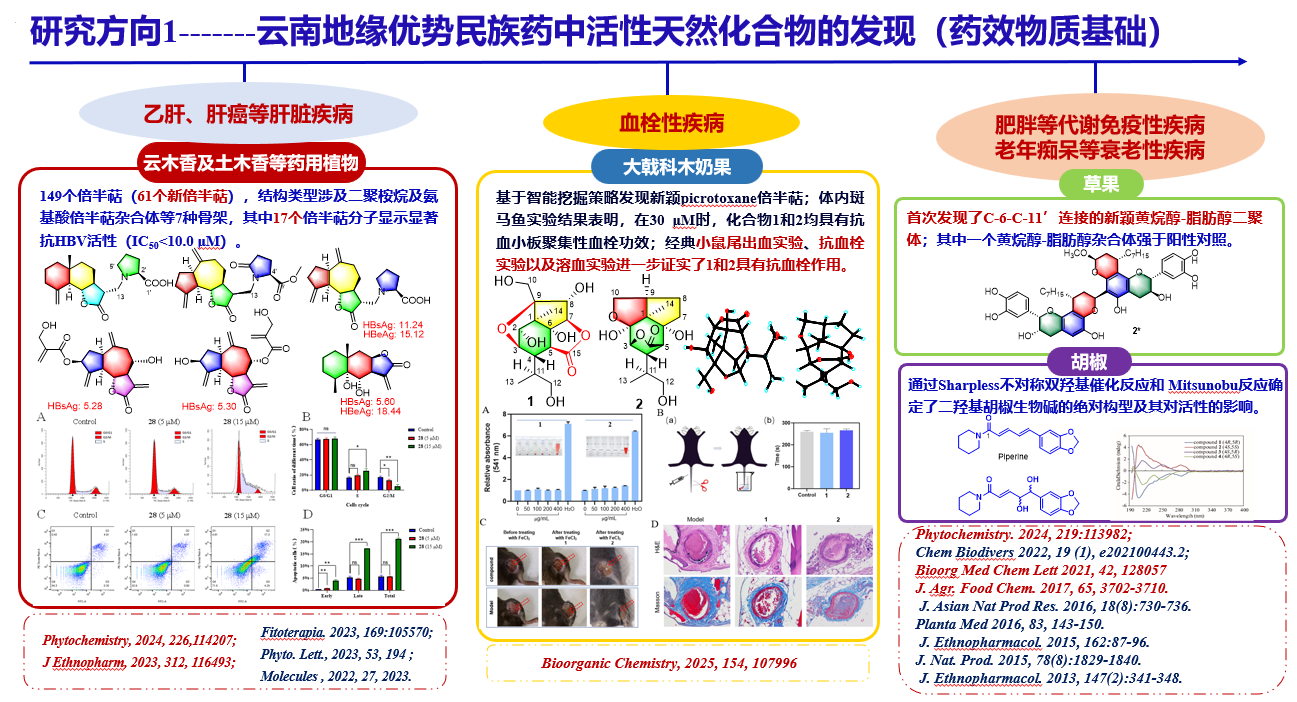 课题组为一级学科博士点(生物学植物学方向和生物化学与分子生物学方向)、生物与医药专业学位博士点(制药工程)以及药学硕士点(药物化学和药理学方向)提供支撑。依托国家自然科学基金(包括面上项目、地区项目、青年基金C类项目)以及云南省重大科技专项计划等项目的持续资助,聚焦云南丰富的生物资源,采用天然药物化学与生物学方法相结合的多学科交叉策略,致力于从西部及“一带一路”国家民族药中发现治疗乙肝病毒感染性疾病及其并发症(肝纤维化、肝硬化、肝癌等)、代谢性疾病(肥胖、高血脂症等)和衰老性疾病(神经退行性疾病等)的天然活性化合物,并阐明其靶标机制,形成了如下研究方向: