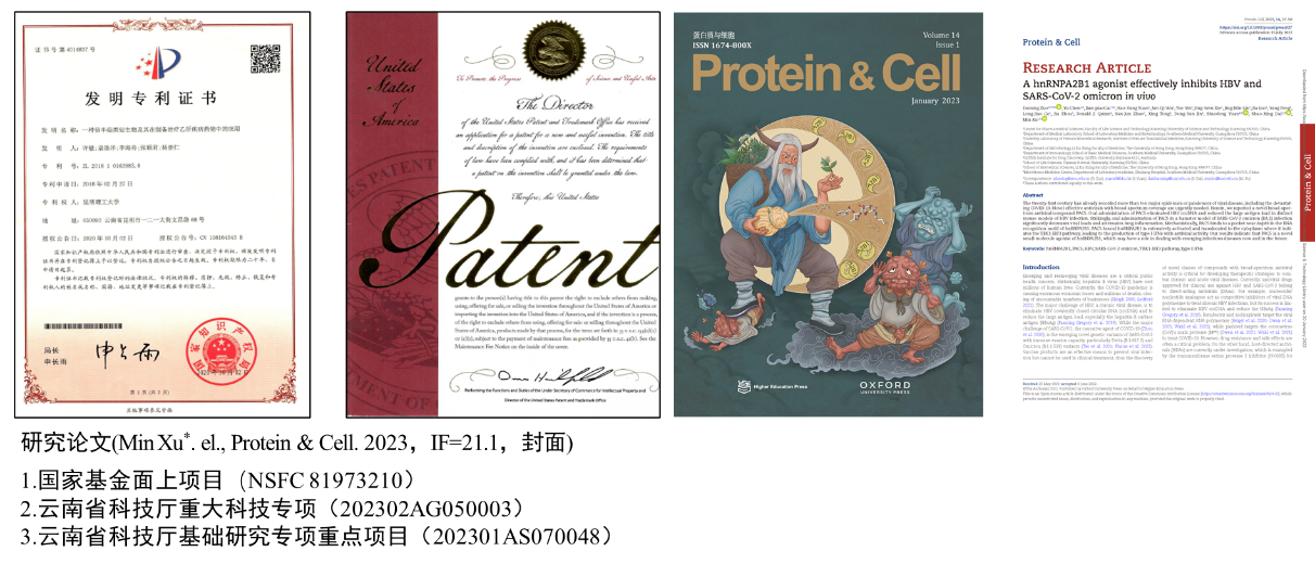 5) 云南省科技厅基础研究专项重点项目:基于全新抗病毒靶标蛋自hnRNPA2B1结构的药物设计与合成研究(2023.06-2026.05),50万元(主持人,许敏,在研)