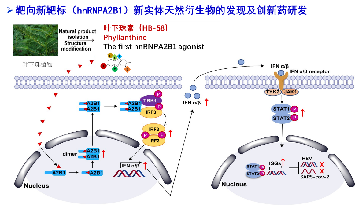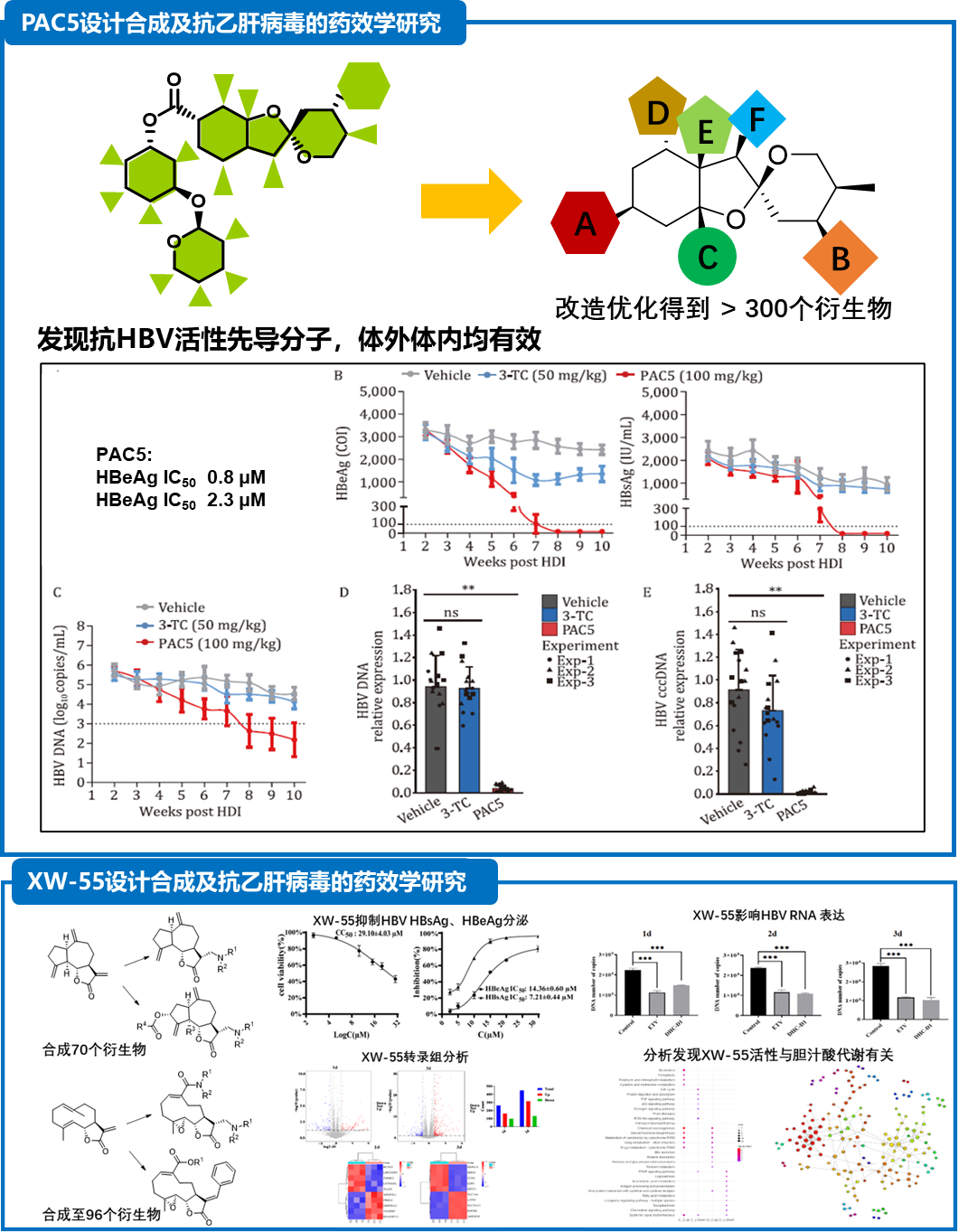 乙型肝炎病毒感染是全球关注的重大公共卫生问题。据统计,中国现有慢乙肝感染者超7500万(占全球1/3),全球40%的肝癌来源于中国,这也使我国成为了全球乙肝负担最重的国家。因此,亟需能够提高慢乙肝患者临床治愈率的新药问世。课题组基于方向二和方三的工作基础,开展天然原始创新药研发与转化研究。目前具有自主知识产权的 1 类抗乙肝病毒候选药物(新靶标新机制新结构),正在进行系统临床前研究,计划与合作单位共同提交临床试验申请(IND)。