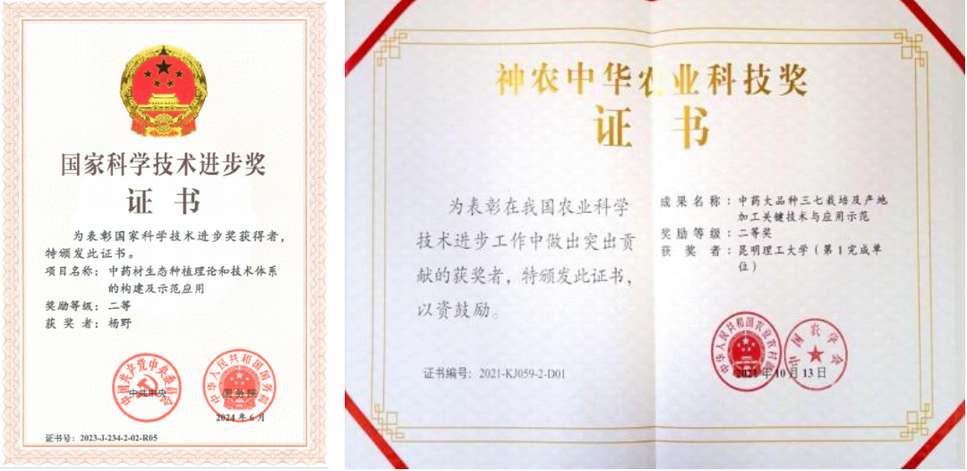 (3) 三七生态种植实现全产业链革新,攻克了连作障碍、质量溯源等难题,建立了绿色栽培技术体系(获农业农村部神农中华农业科技二等奖,国家科技进步二等奖)。