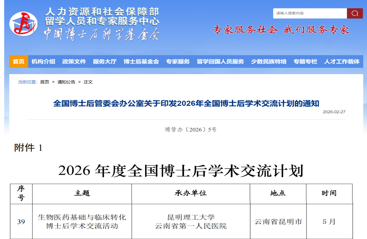 2026年2月27日,经全国博士后管委会办公室审批,由昆明理工大学和昆明理工大学临床医学院/云南省第一人民医院联合申报的“2026生物医药基础与临床转化博士后学术交流活动”成功入选“2026年全国博士后学术交流计划”。该项目由学校人事处组织,生命科学与技术学院、灵长类转化医学研究院,联合临床医学院/云南省第一人民医院,依托学校生物学博士后流动站申报。据悉,2026年全国共获批45个博士后学术交流活动,我校是云南省唯...